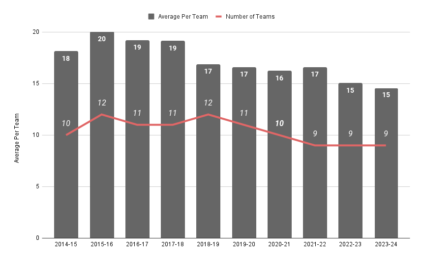 We have to look a bit deeper into the data. First, the number of teams in the THL has fluctuated yearly. Over the last ten-year span, the THL is at its lowest number of teams, at nine in the past three seasons. During the early part of our data, the league was either 11 or 12 teams in most seasons. One of the teams was usually either PZHL U23 or the SMS Sosnoweic U20 squad. This meant there was a team of nothing but young Polish players. Removing them obviously takes out a lot of native players. While the number of Polish players has declined, the amount per team is not that big of a decline.