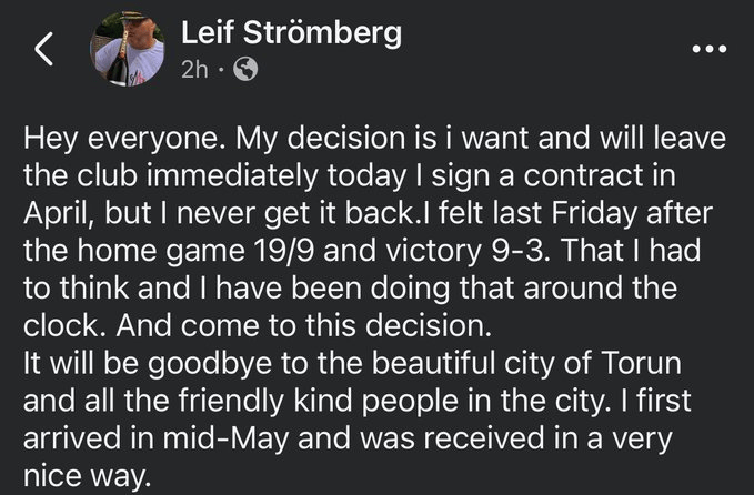 Sept 24. Leif Strömberg departed from KH Torun. The Swedish head coach announced his departure in a Facebook post. He noted the club was experiencing various issues, including no WIFI or mattress provided in his apartment, missed payments to players, and broken promises from management.